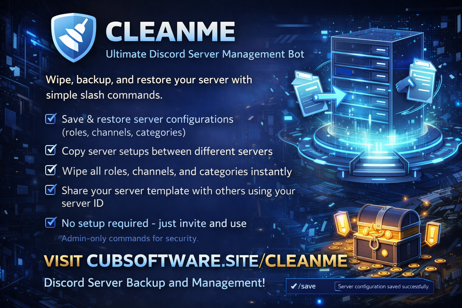 The platform also includes two Discord bots: CUB PROTECTOR, a moderation and server security bot, and CleanMe, which allows Discord communities to share and copy server setups instantly. Both bots are free and managed through dedicated web dashboards.